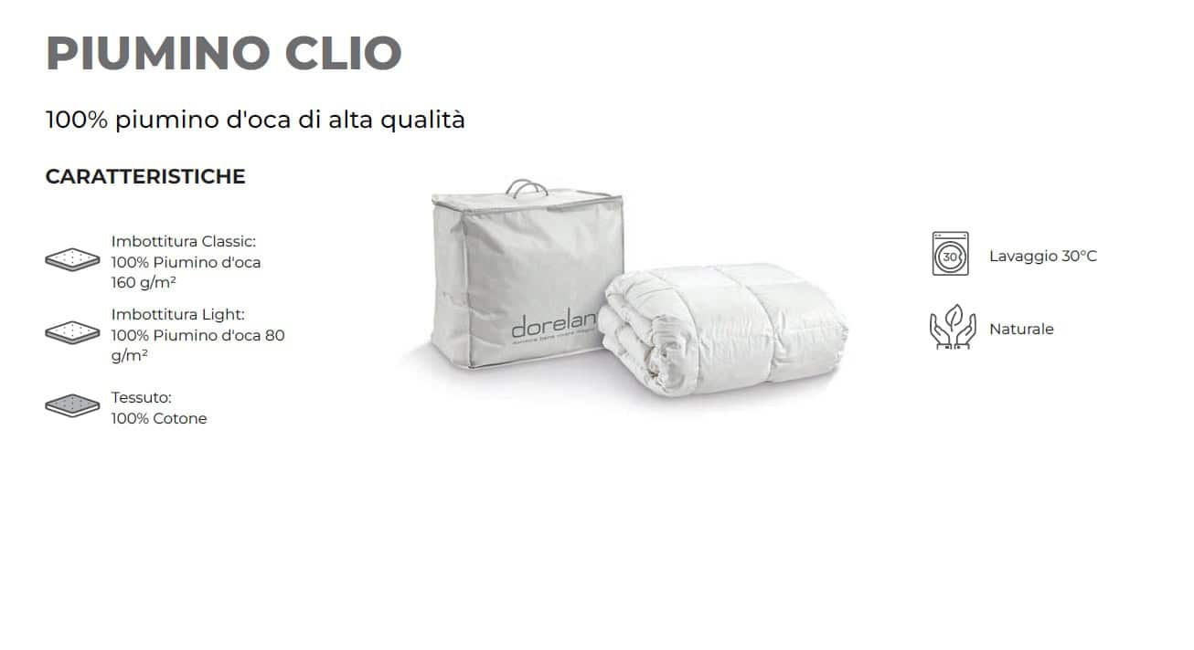Il piumino Clio è composto al 100% da pregiato piumino d’oca di altissima qualità che svolge un’importante funzione termoregolatrice mantenendo una piacevole temperatura durante il riposo. La trapuntatura a quadri fissi mantiene una corretta distribuzione del piumino anche durante il lavaggio