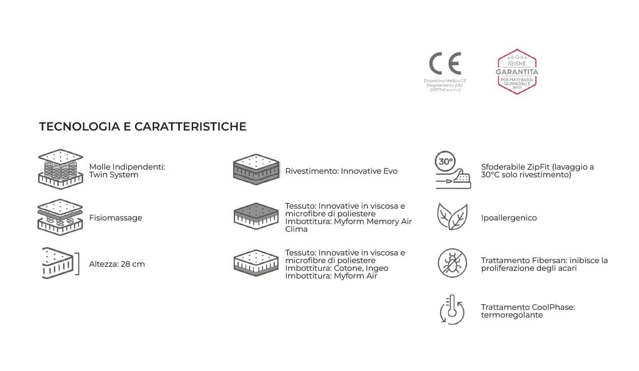 Il rivestimento in viscosa, arricchito dalla fascia in velluto, esprime eleganza e attenzione ai dettagli. L’imbottitura in Myform Memory Air Clima sul lato invernale offre un’accoglienza termoregolante e traspirante. Fibersan e CoolPhase garantiscono protezione e gestione ideale del microclima. Il molleggio Twin System, con spirale doppia, offre un sostegno calibrato e preciso, accompagnato da FisioMassage, che asseconda il corpo con fluidità. Sul lato estivo, l’imbottitura in cotone e Ingeo assicura freschezza naturale e dispersione ottimale dell’umidità. Levant, l’eleganza del comfort che accompagna ogni stagione.