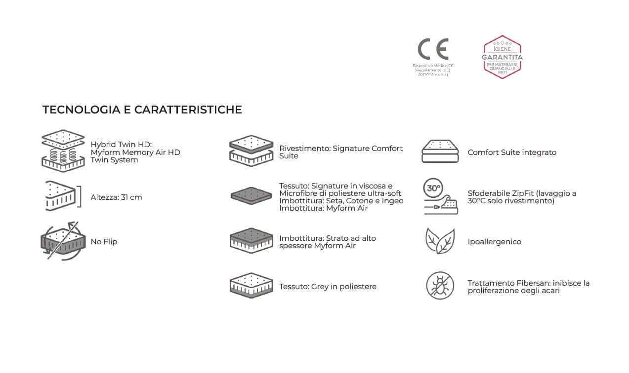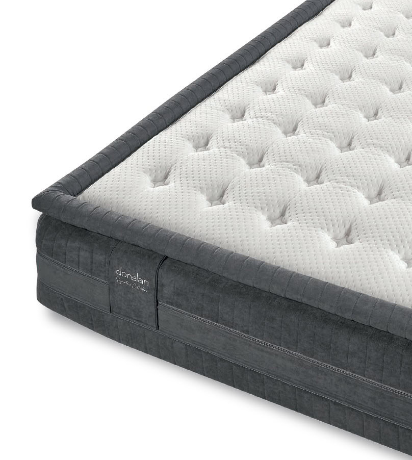 All’interno, il sistema di molle a doppia spirale lavora in perfetta armonia con il Myform ad altissima densità per offrire un supporto personalizzato e armonioso, in grado di adattarsi con eleganza ai movimenti del corpo.