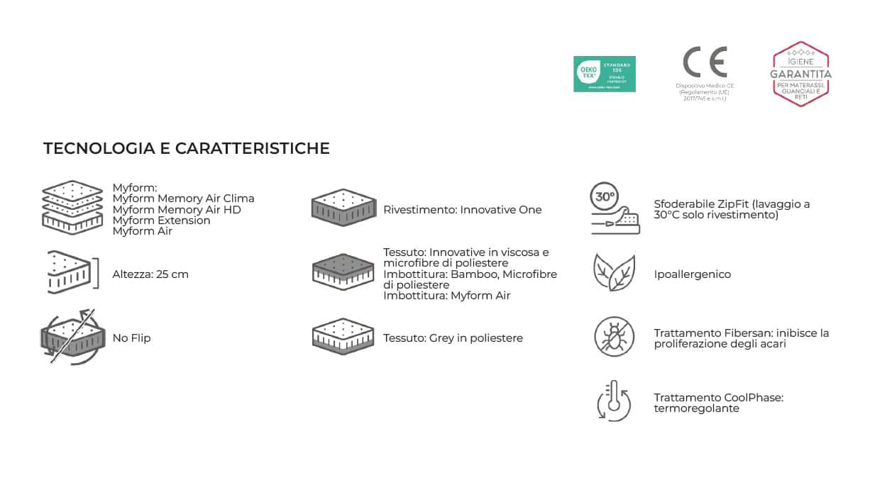 Pensato per offrire il massimo comfort, Evoke unisce tecnologia evoluta e materiali naturali. Il rivestimento in viscosa dona morbidezza al tatto, mentre l’imbottitura in bamboo garantisce freschezza costante. Fibersan assicura un ambiente protetto e igienico, CoolPhase regola il microclima per un benessere continuo. Lo spessore maggiorato di Myform Memory Air Clima equilibra accoglienza e freschezza, mentre il Myform Memory Air HD accoglie il corpo con un sostegno ergonomico profondo. Myform Extension completa il sistema offrendo elasticità e stabilità. Evoke, il comfort profondo che accompagna il corpo in ogni fase del riposo.