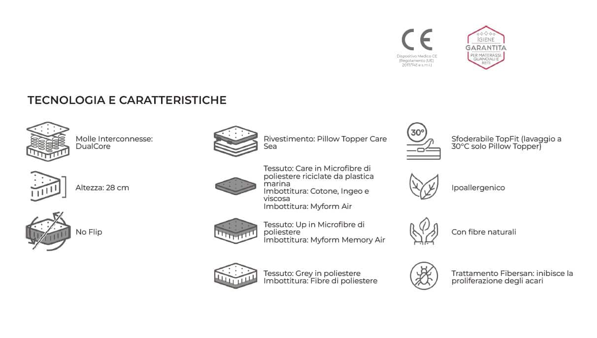 Sereno è pensato per chi cerca un comfort più evoluto, ma con il calore della tradizione. Lo strato in Myform Memory Air è posizionato nel piano sopra le molle DualCore, per offrire una risposta graduale e una riduzione efficace dei punti di pressione. Il Pillow Topper trapuntato capitonné, sfoderabile e lavabile, accoglie con morbidezza grazie a Cotone, Ingeo e Myform Air. Il tessuto sostenibile riciclato da plastica marina, e il trattamento Fibersan antiacaro a base di oli essenziali naturali, completano un sistema letto solido, affidabile, e semplice da gestire.