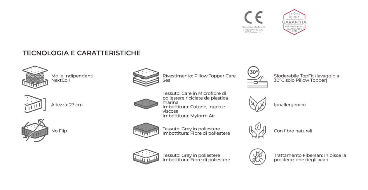 Velar abbina le molle indipendenti e insacchettate NextCoil a un Pillow Topper sfoderabile in Cotone, Ingeo e Myform Air, per offrire comfort differenziato e sensazione di benessere naturale. Il sostegno è calibrato sulle diverse aree del corpo, mentre la morbidezza del Pillow Topper accompagna ogni posizione con armonia. Il tessuto, realizzato con materiali riciclati da bottiglie marine, garantisce sostenibilità e igiene, grazie anche al trattamento antiacaro Fibersan a base di oli essenziali naturali. Disegno capitonné che restituisce un’estetica calda e senza tempo, per chi ricerca la qualità del riposo unita alla cura di ogni singolo dettaglio.