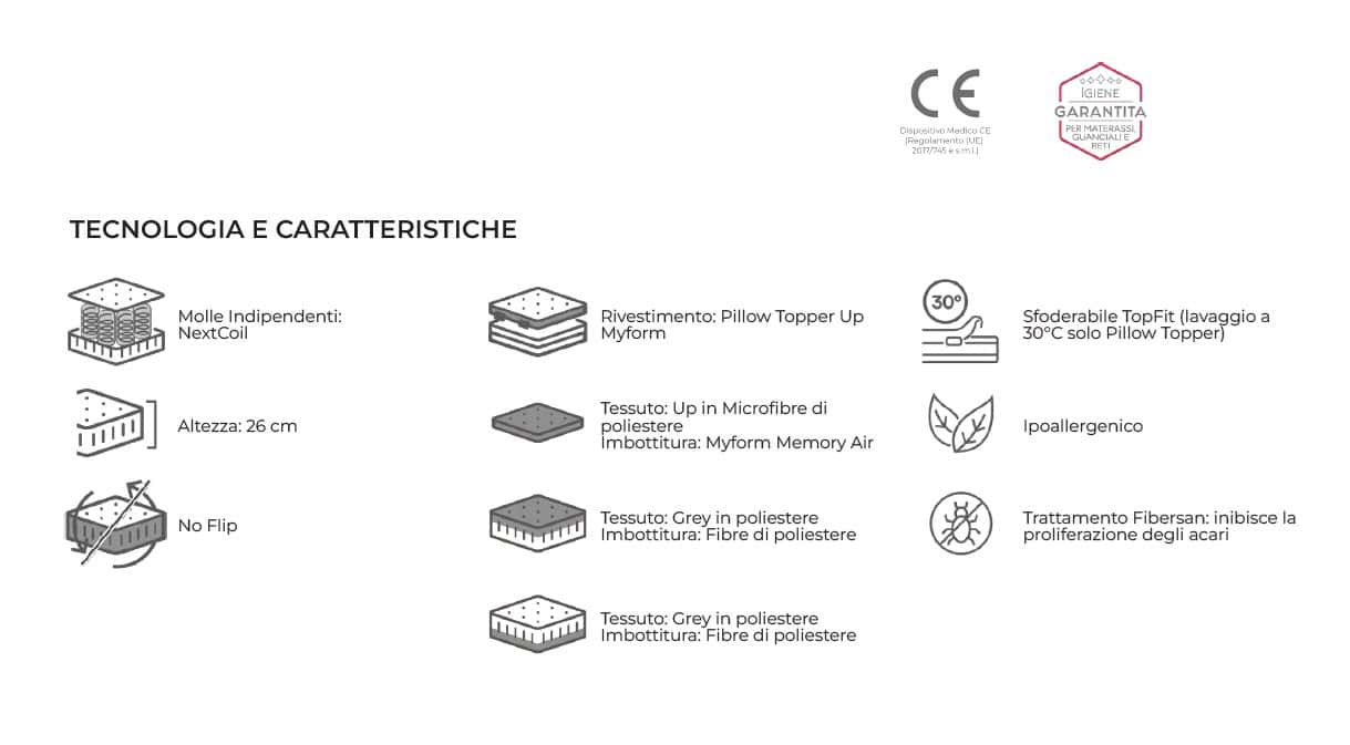 Aura unisce molle NextCoil indipendenti a un Pillow Topper sfoderabile con Myform Memory Air, che si adatta ai profili del corpo e riduce i punti di pressione. La struttura lavora in modo differenziato su ogni zona, offrendo sostegno e comfort calibrati. Grazie alla sua struttura a celle aperte, il Myform Memory Air all’interno del topper mantiene il piano di riposo più asciutto. Fibersan garantisce una protezione attiva dagli acari. Una soluzione confortevole e pratica, pensata per chi vuole un materasso funzionale con un tocco di accoglienza in più.