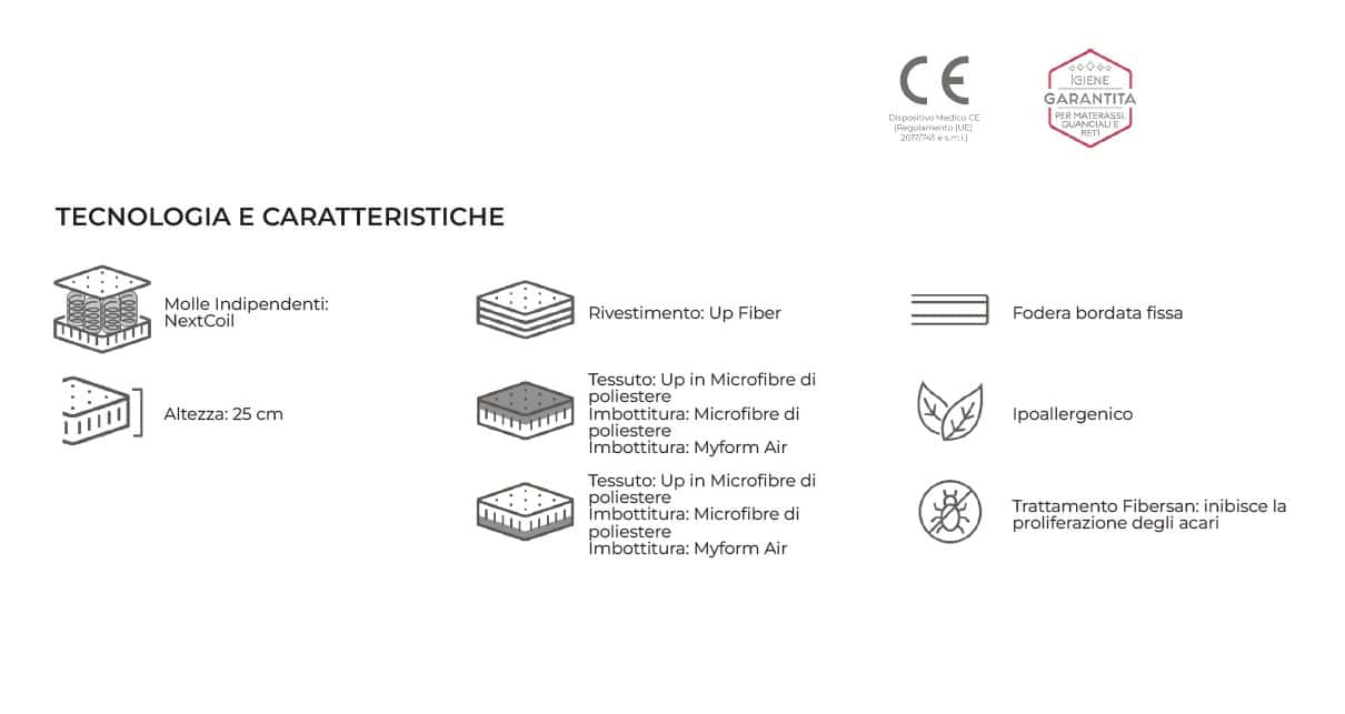 La tecnologia NextCoil a molle indipendenti con 7 zone a portanza differenziata offre il giusto sostegno a ogni parte del corpo. La struttura lavora in modo mirato, favorendo l’allineamento posturale e migliorando il comfort in ogni posizione. La fodera combina fibre traspiranti e Myform Air, migliorando la dispersione dell’umidità e mantenendo la superficie fresca anche in estate. Fibersan, agli oli essenziali, inibisce la presenza di acari e aiuta a mantenere un ambiente letto più pulito.