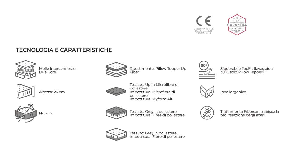 Gryphon unisce il sostegno dinamico delle molle DualCore a un Pillow Topper sfoderabile, facile da rimuovere e lavare. La struttura segue i movimenti del corpo con elasticità favorendo una sensazione di leggerezza durante il sonno. Il Pillow Topper, realizzato in fibre traspiranti e Myform Air, mantiene il piano di riposo fresco e ventilato anche nelle stagioni più calde. Fibersan completa il sistema con un’azione antiacaro profonda, ideale per chi vuole dormire bene e vivere meglio. Perfetto per chi cerca funzionalità, semplicità e comfort ben costruito.