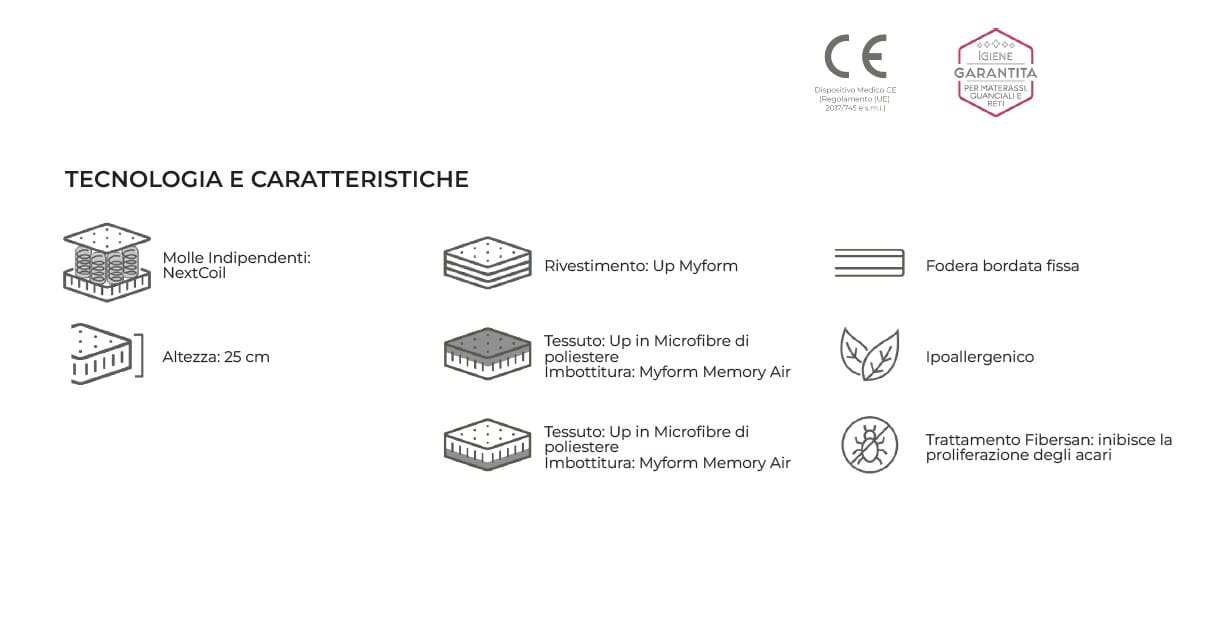 Tecnologia NextCoil con molle indipendenti insacchettate a 7 zone a portanza differenziata per offrire un supporto che segue perfettamente la morfologia del corpo. Lo strato in Myform Memory Air accoglie in modo graduale, alleggerendo la pressione nei punti più sensibili e migliorando il rilassamento. La fodera con tessuti traspiranti e Fibersan, trattamento antiacaro a base di oli essenziali naturali, favorisce il microclima e la protezione da acari. Perfetto per chi cerca un comfort più evoluto ma senza rinunciare alla semplicità di utilizzo.