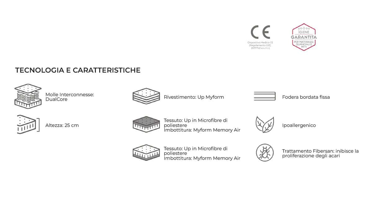 Pensato per chi desidera un comfort più personale, senza rinunciare alla praticità di un materasso ben strutturato. Le molle interconnesse DualCore offrono una risposta progressiva, mentre lo strato in Myform Memory Air si adatta al profilo del corpo riducendo i punti di pressione, mantenendo la superficie asciutta durante la notte. Il trattamento antiacaro Fibersan agisce sulla superficie per migliorare l’igiene quotidiana. Un equilibrio riuscito tra sostegno attivo e accoglienza precisa, da vivere ogni notte.