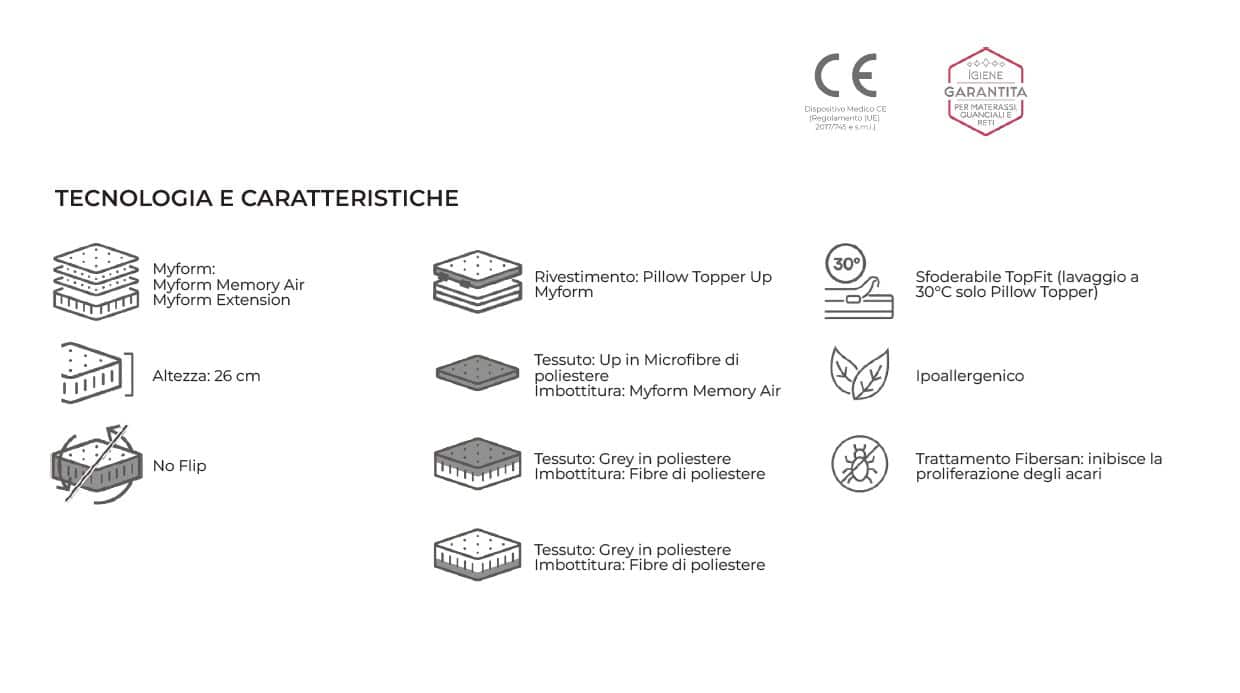 Mira integra perfettamente Myform Extension con un doppio strato in Myform Memory Air, presente sia nella struttura interna che nel Pillow Topper sfoderabile. Il comfort è progressivo e bilanciato: la base sostiene in modo omogeneo, mentre il Myform Memory Air accoglie e si adatta al corpo riducendo i punti di pressione e mantenendo una buona ventilazione. Fibersan protegge la superficie da acari e allergeni. Un materasso evoluto, ma pratico, che coniuga comfort tecnico e semplicità d’uso.